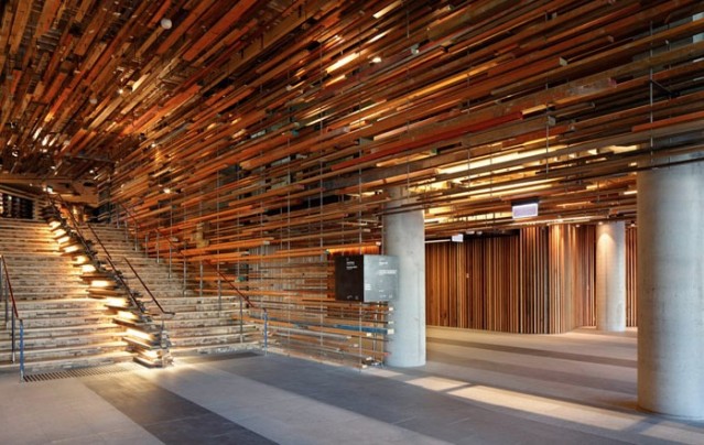 march studio adds thousands of timber planks to staircase of canberra's hotel hotel